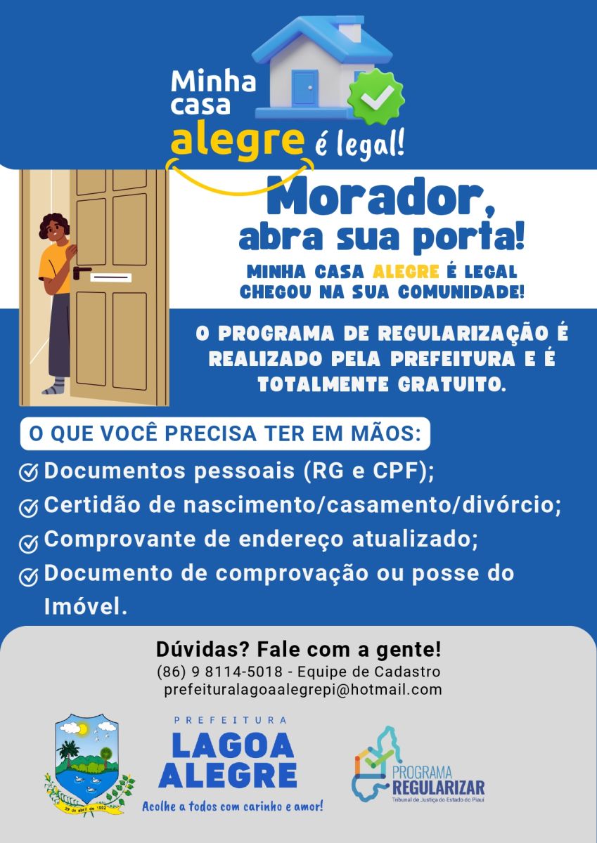 O programa tem como objetivo garantir que as famílias lagoa-alegrenses possam ter o título definitivo de suas moradias, promovendo mais dignidade, segurança e valorização patrimonial.